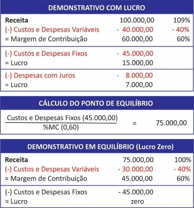 Na demonstração, é possível verificar que, com o valor das vendas em R$ 100.000,00, o empresário terá um lucro operacional de R$ 7.000,00. Caso o faturamento venha a atingir R$ 75.000,00, igualaria as receitas com as despesas, não havendo lucro e nem prejuízo, e resultaria em equilíbrio.