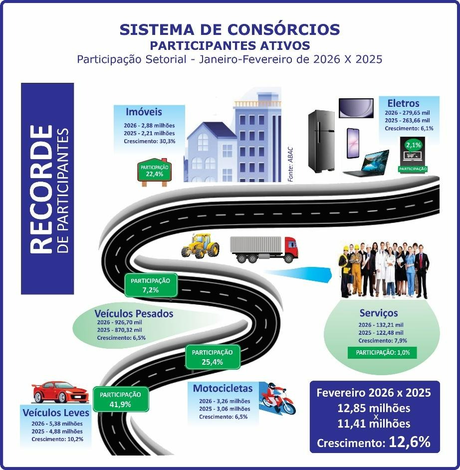 O Sistema de Consórcios inicia 2026 em crescimento, com destaque para os 12,85 milhões de participantes ativos registrados ao fim do primeiro bimestre — novo recorde histórico e alta de 12,6% sobre o ano anterior . Quer entender o que impulsionou esse resultado? Continue a leitura.