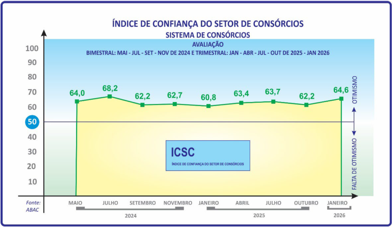 O ICSC – Índice de Confiança do Setor de Consórcios, da ABAC, chegou a sua nona edição, em fevereiro de 2026. Atingindo o segundo melhor desempenho da sua história, o indicador sinaliza boas expectativas para o próximo trimestre do consórcio, mesmo com a desaceleração da economia.