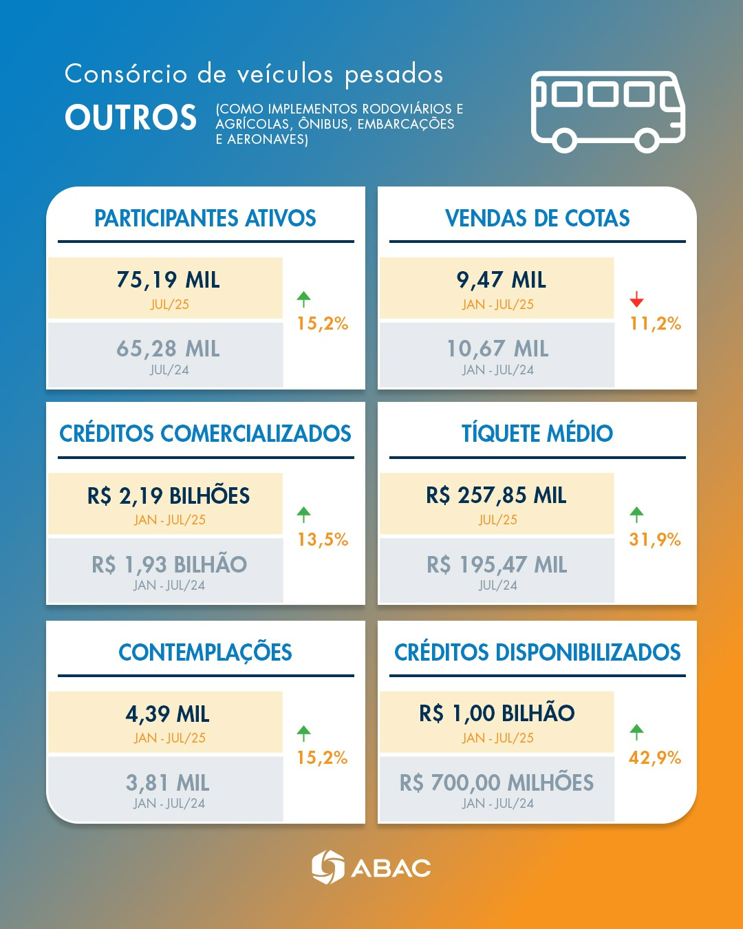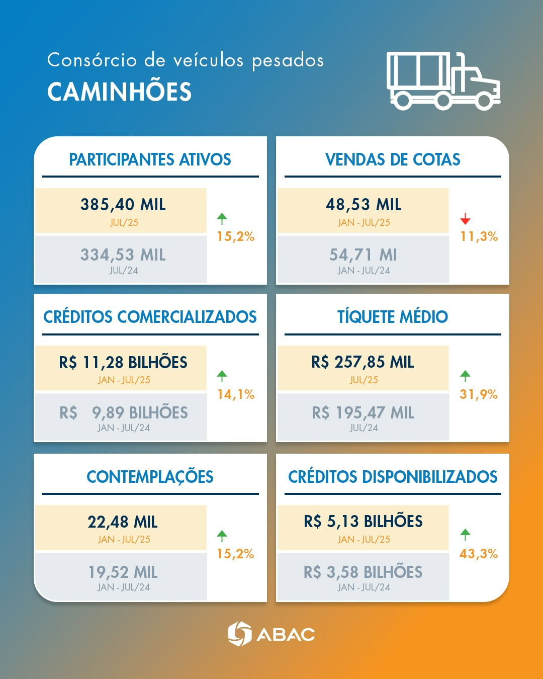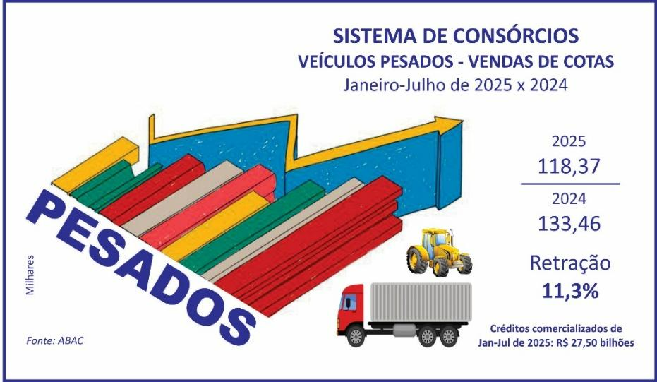 A ABAC apresentou novidades ao divulgar o desempenho do Sistema de Consórcios em julho. A partir de agora, os resultados do segmento de veículos pesados seguem novos demonstrativos. O novo formato apresenta os números do segmento de pesados com maior detalhamento, o que contribui para melhores análises.