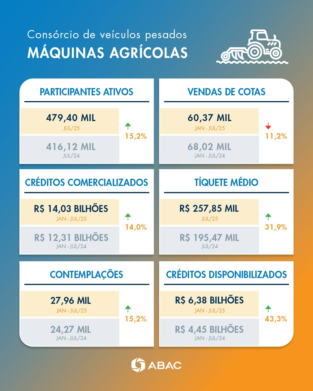 Ao considerar somente os estimados 51,0%, relativos à participação dos consorciados de Máquinas Agrícolas no total dos Veículos pesados, foram observadas situações semelhantes às apresentadas nos comentários gerais do setor. Desta forma, os resultados abaixo, proporcionais à presença, retratam somente acumulados de vendas, volume de negócios, contemplações e créditos concedidos, além dos participantes ativos de Máquinas Agrícolas.