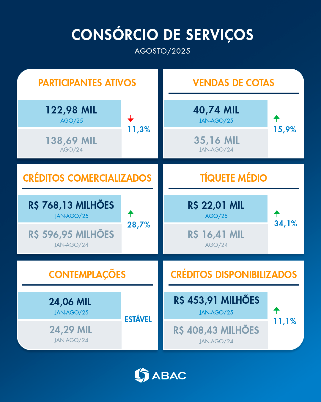 O consórcio de serviços encerrou os oito meses anotando quatro indicadores positivos, um negativo e um estável. Ao propiciar diferenciais únicos como flexibilidade e diversidade por ocasião da utilização dos créditos, a modalidade disponibilizou R$ 450 milhões em créditos de janeiro a agosto. Ao anotar alta de 15,9% nas vendas de cotas acumuladas naquele período deste ano versus o do ano passado, registrou também crescimento de 28,7% em créditos disponibilizados.